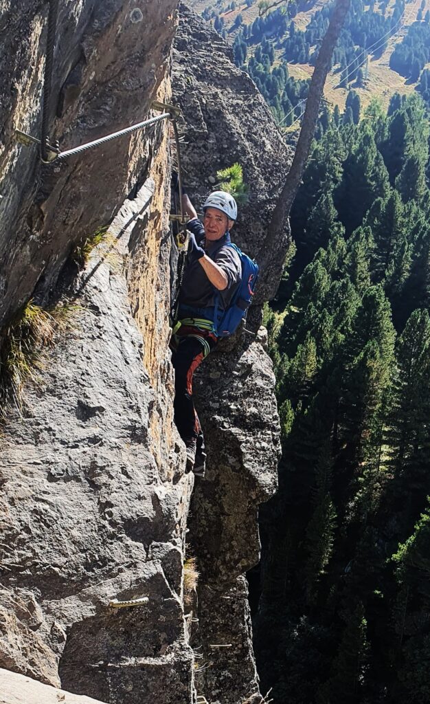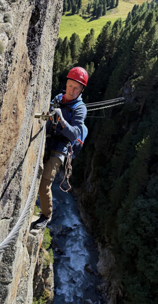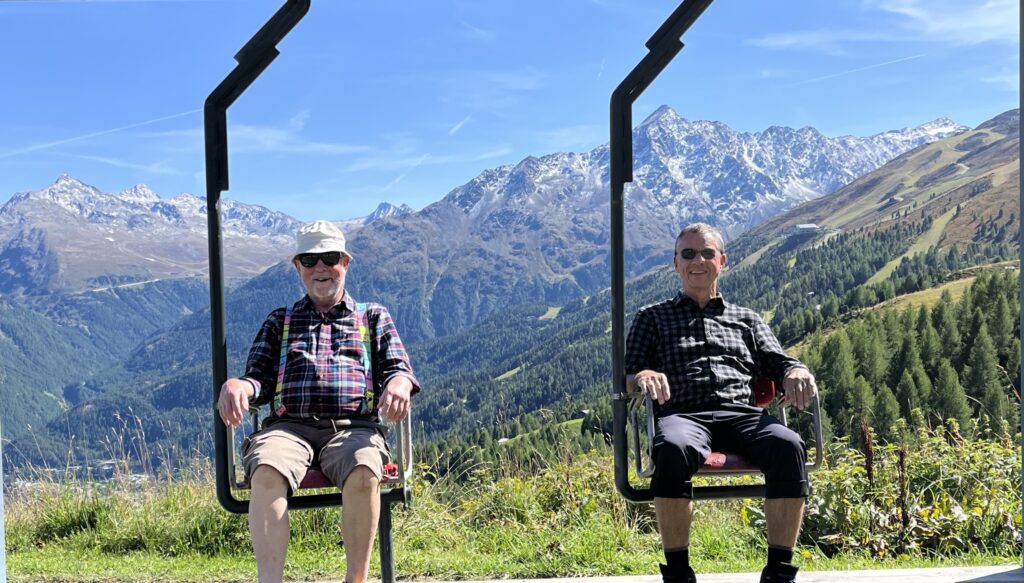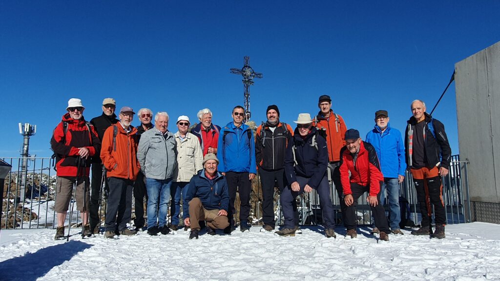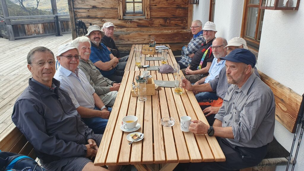 Kaiserwetter am Samstag, dem letzten Wandertag. Unten im Tal sonnig aber noch recht kühl machten sich die gesamte Gruppe auf mit der Gondel zum 3000m hohen Gaiskogel zum Gruppenbild im Schnee. Oben angekommen erschloss sich uns bei strahlendem Sonnenschein ein überwältigender Anblick über die gesamte regionale Alpenwelt, Bergspitzen und Täler soweit man sehen konnte. Zum Nachmittag teilte sich die Gruppe auf mit verschiedenen Zielen. Zwei waghalsige fuhren mit dem Bus nach Obergurgel um den Zirbenwald-Klettersteig mit Seilbrücken über rauschenden Bäche und senkrechten Felswänden zu bewältigen, natürlich mit entsprechender Kletterausrüstung. Eine Gruppe ging von der Mittelstation zur Rettenbach-Alm nach Hochsölden, weiter zu Marias Alm dann nach Sölden. Der restliche Nachmittag gab Gelegenheit zu Einkäufen von österreichischen Spezialitäten wie Bergkäse, Schinken und Schüttelbrot,